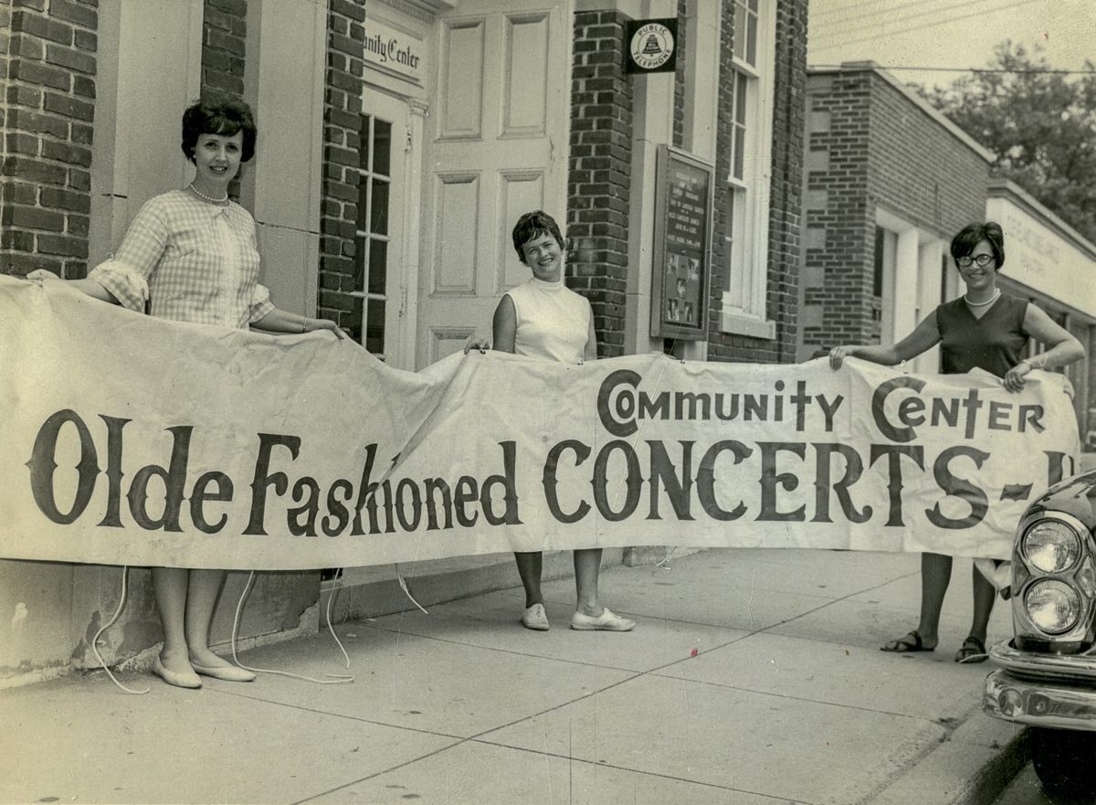Three women holding a banner for "Olde Fashioned Concerts" organized by the OGRCC.Collection