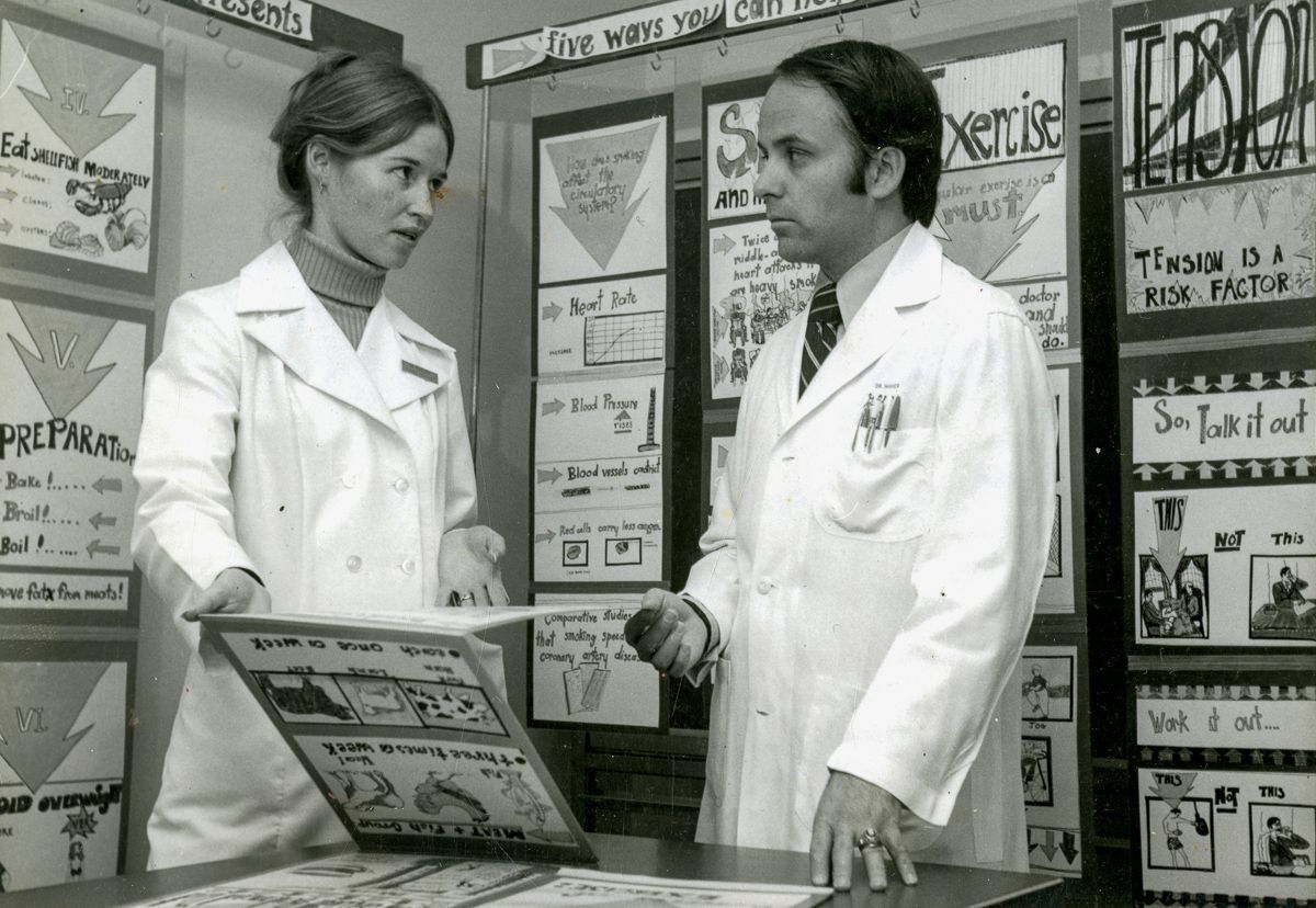 Dr.'s Maher and Ceusi discussing public health poster's.