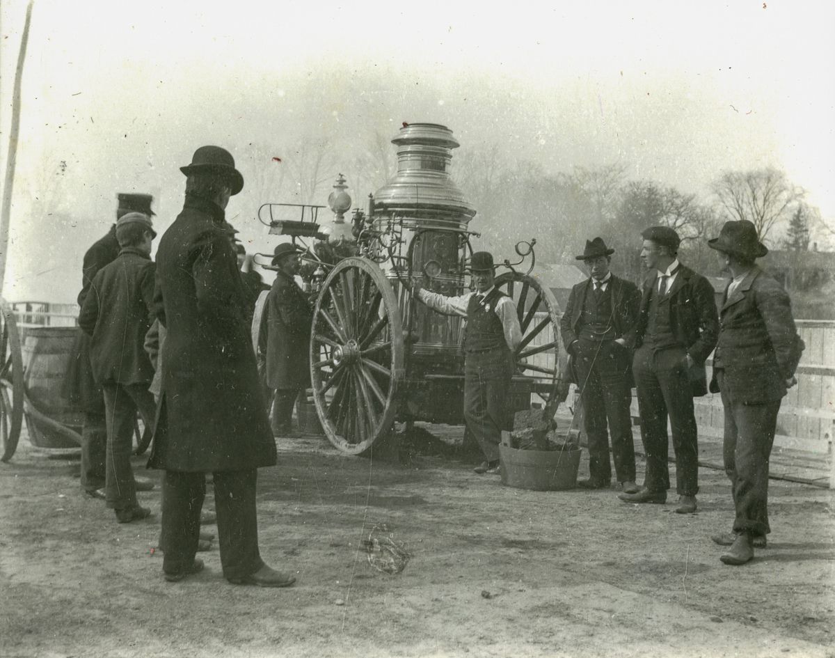 A group of men standing around an early fire engine that belonged to the Mianus Fire Company.Collection