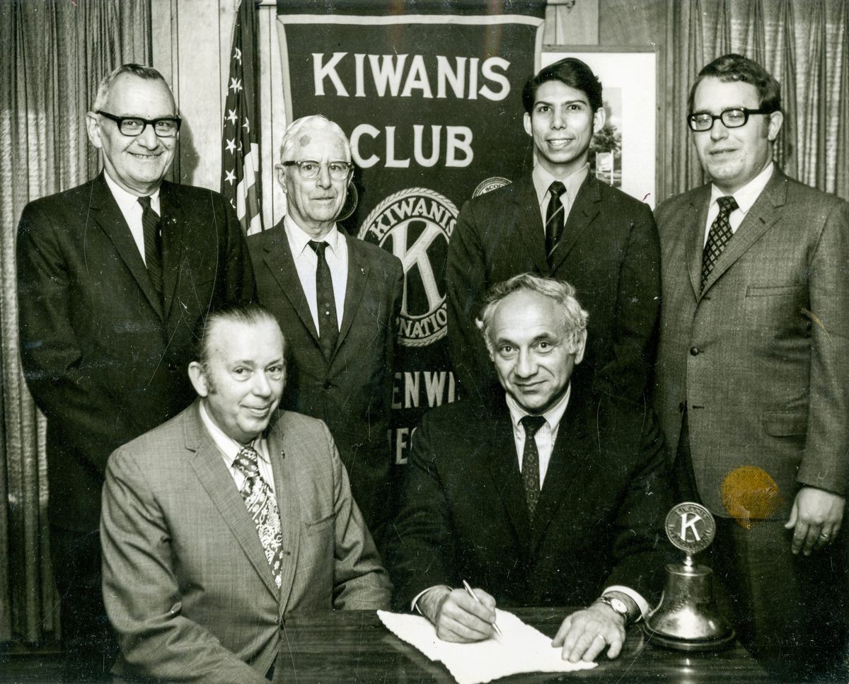 A group of Kiwanis Club members posing with a member signing a document with a Kiwanis Club branded bell on the table beside him.Collection