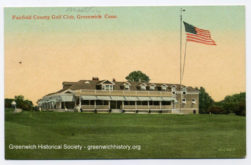 A depiction of the club house showing the awnings and covered porch which wraps around the side of the building. A large American flag flies from a pole.Collection