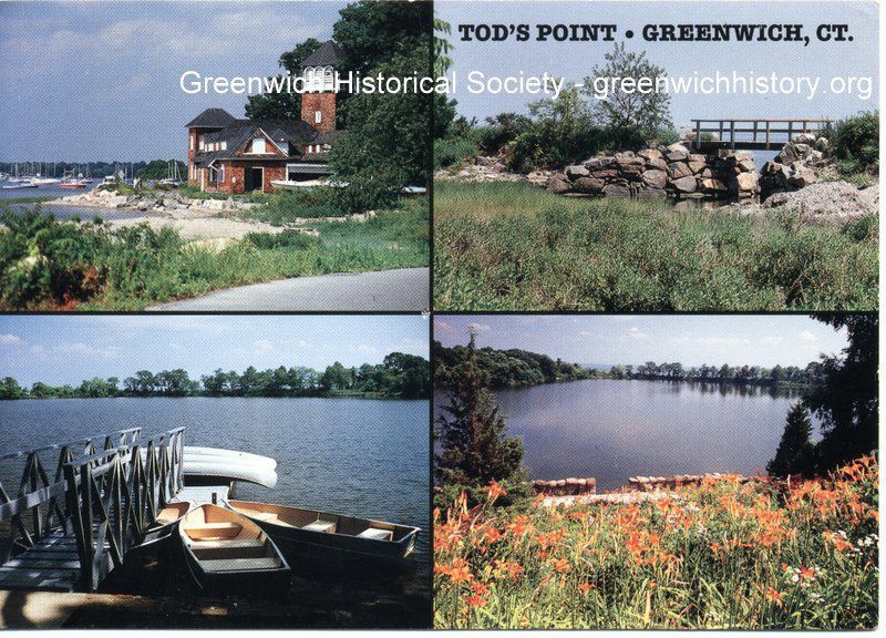 Four images of Tod's point. The top left image is of the boathouse on the backside of Tod's Point where the harbor is. The top right image is of a wooden bridge that crosses over a little stream. The bottom left image is of a couple of row boats docked. The bottom right image is taken from Mr. Tod's estate; there are orange wild flowers, a stone wall and a large pond.Collection