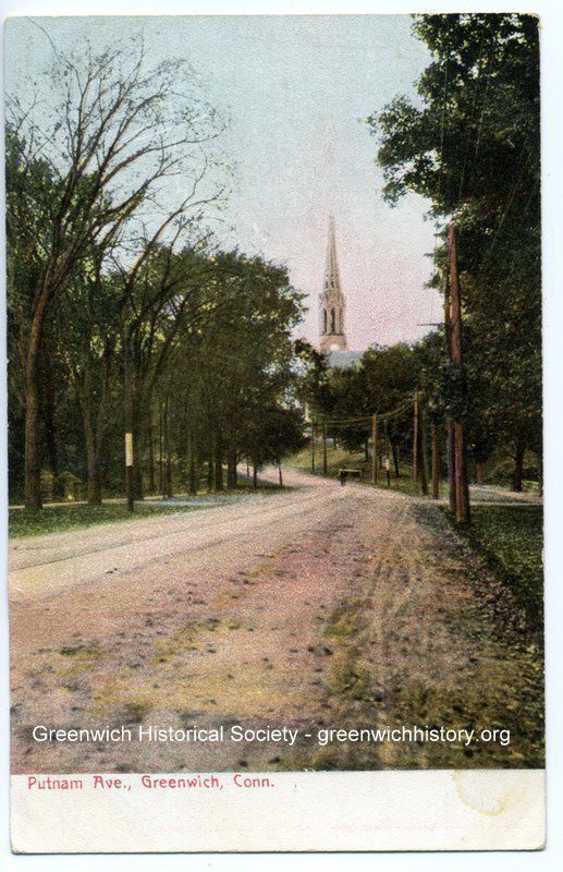 A depiction of Putnam Avenue extending up the hill towards the Second Congregational Church. The road is dirt and there are many trees along the sides of the road.Collection