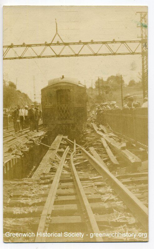 A close up view of the back of a train during a train wreck. After a train derailed from the tracks, the train cars and track were left in serious damge. Men stand next to the train on the left and others look over a fence to the right of the image.Collection