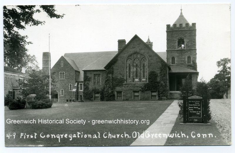 Front view of the church showing the large stained glass window and a sign with mass times.Collection