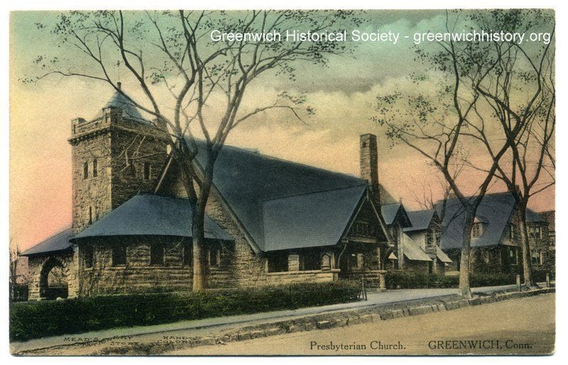 Side view of the church that shows the porticoed entrance, the stone tower, and the rounded projection, but without a thick ivy cover. The sidewalk can be seen in the foreground.Collection