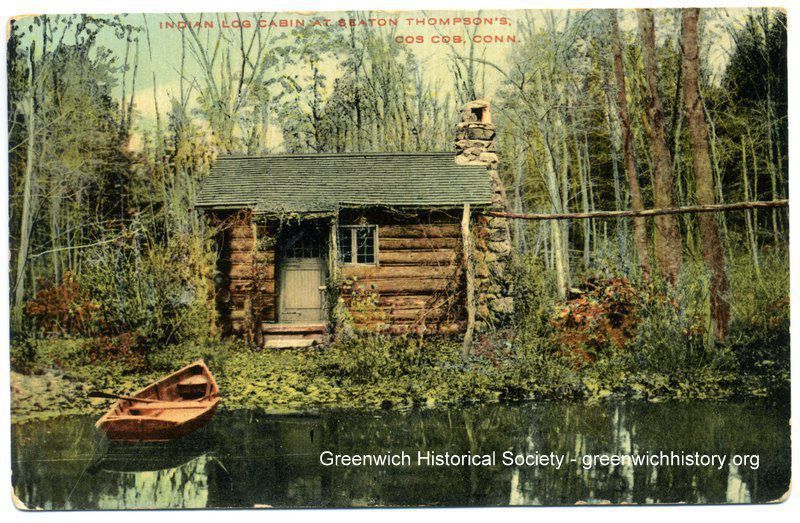 A log cabin in the woods. The cabin has a stone chimney and one window and door. There is an orange row boat docked in the pond in front of the cabin.Collection