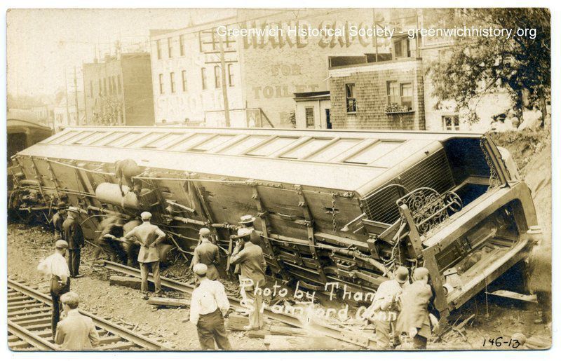A close up view of a train wreck. The train derailed from the track leaving a train car on its side. Men stand next to the car examining the situtation. Behind the train are buildings.Collection