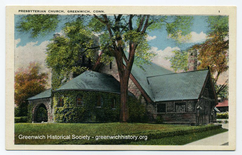 View of the stone church from Putnam Avenue, showing the ivy that covers that side of the building. A portico, square tower, and the distinctive rounded projection can be seen.Collection