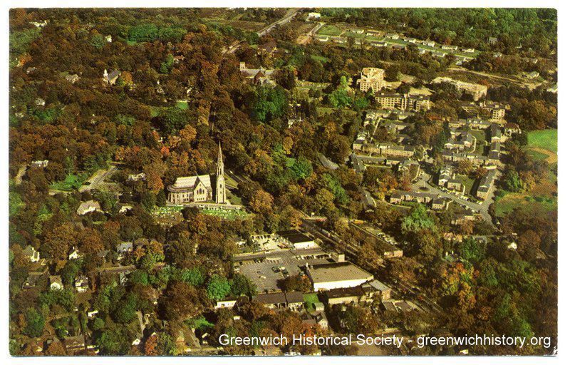 Aerial view of the area around the Second Congregational Church showing the church with steeple and the surrounding buildings.Collection