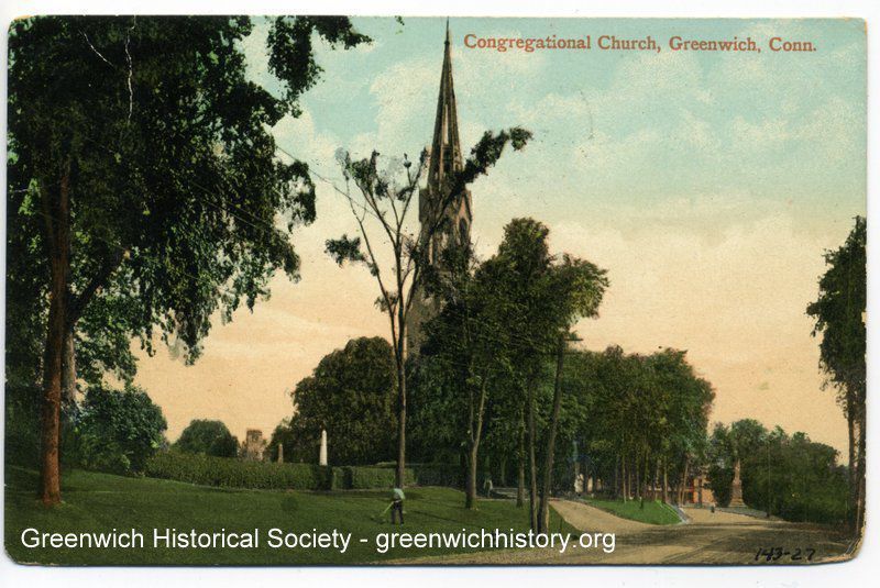 Deptiction of the street leading up to the church. The majority of the church is obscured by trees but the steeple can still be seen above the trees. The tops of monuments in the cemetery can be seen above the hedge line. A man works in the lawn along the side of the road.Collection