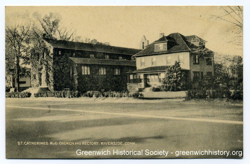 Depiction of the two buildings viewed from the road. The church has ivy climbing the walls. The rectory is a square building with shrubs and trees in front. The street is visible in the foreground.Collection