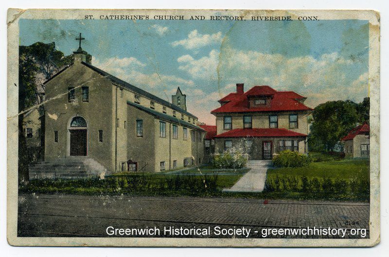 Depiction showing the two buildings. The church is three storeys with a cross at the apex of the roof. The rectory is a square building with a red roof. In the foreground is a street and a path leading up the lawn to the rectory.Collection