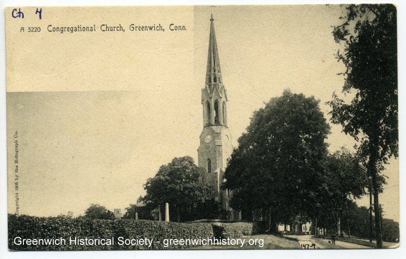 An image of the church steeple with the rest of the buiding obscured by trees and hedges. The tops of monuments in the cemetery can be seen over the hedge. A path leads to the church.Collection
