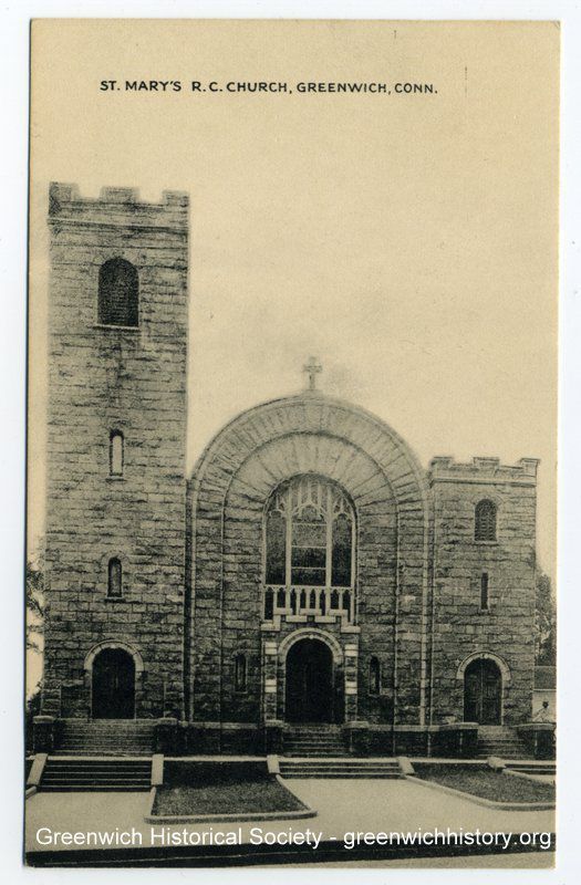 Front view of the stone church with arched windows and doors. A cross stands at the apex of the facade. There is a square tower to the left of the front entrance.Collection