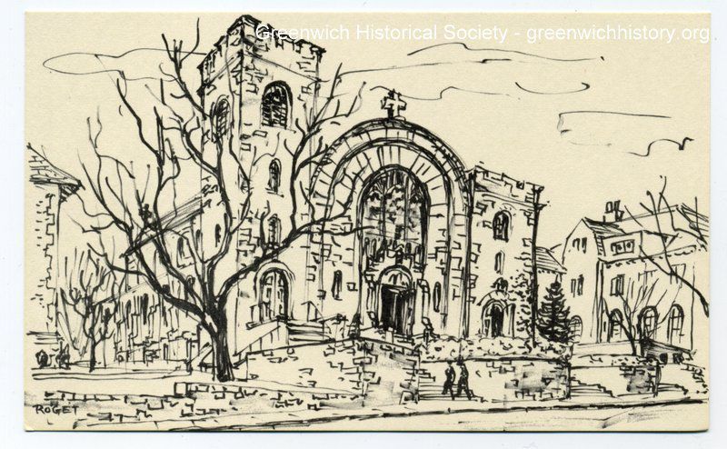 A drawing of Saint Mary's Roman Catholic Church showing the front entrance and a leafless tree. Two people are walking up the steps to enter.Collection