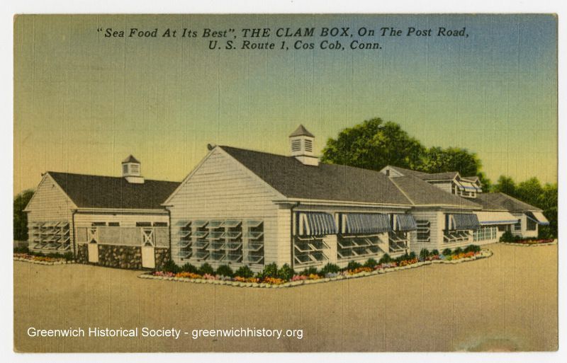 View of the front and side of the white clapboard restaurant, featuring rows of windows on all sides and blue striped awnings.Collection