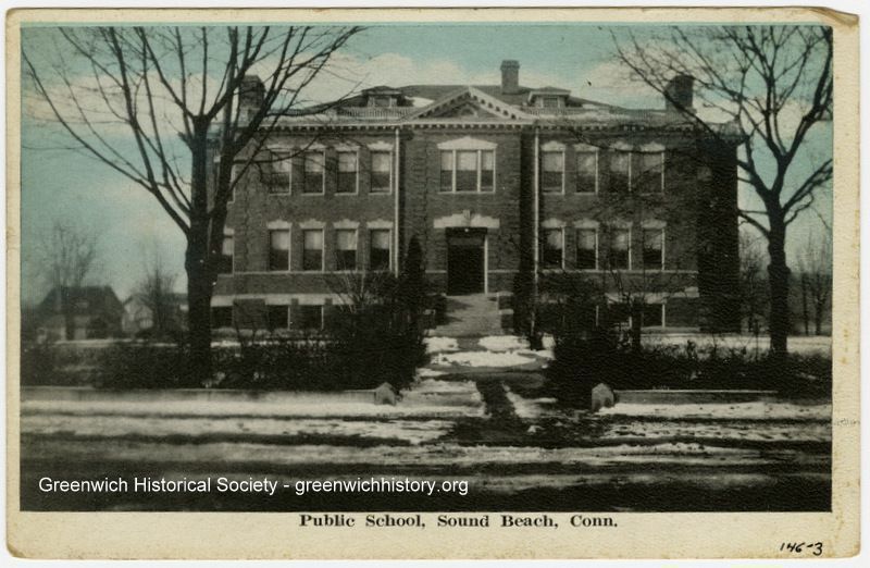 A street view of the Old Greenwich School in winter showing leafless tress and snow.