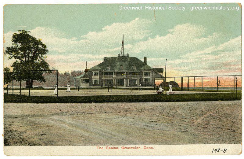 Depiction of the Belle Haven Casino with four women playing tennis on the tennis courts in the foreground. The sun is setting in the background.Collection