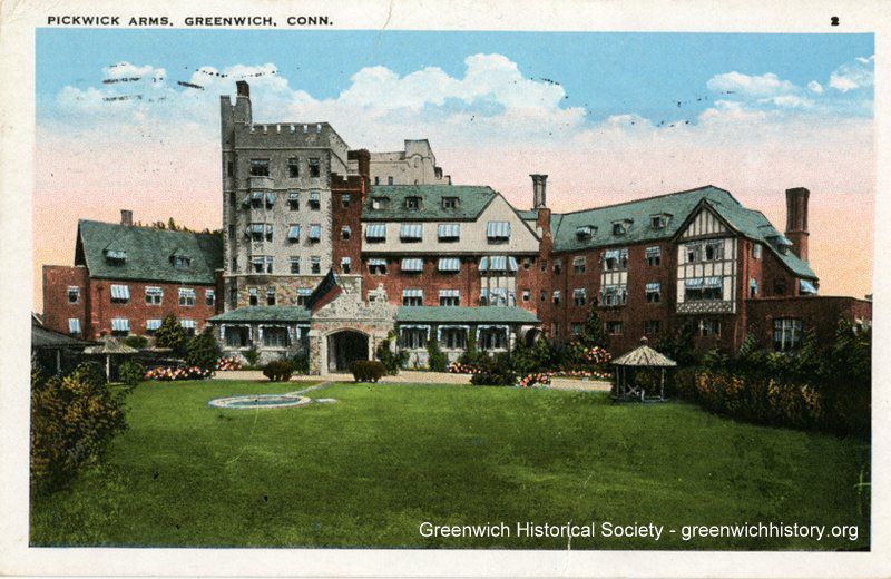 Depiction of the Pickwick Arms showing the red and white bricked building with a green roof. The stone entrance is flying an American flag, and the back lawn features grass, flowering shrubs, trees, a gazebo, and a sunken pool.Collection