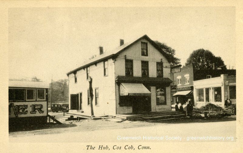 A street view of a section of Cos Cob in the Town of Greenwich known as 'The Hub.' The edge of a train car diner can be seen to the left of the photo, a white building in the middle, with three figures sitting to the side of it.Collection