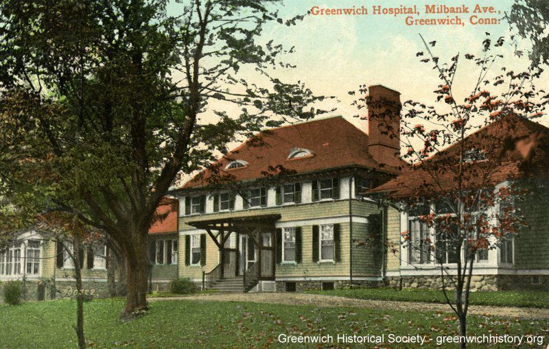 Depiction of the front entrance of Greenwich Hospital, showing the trees and lawn.