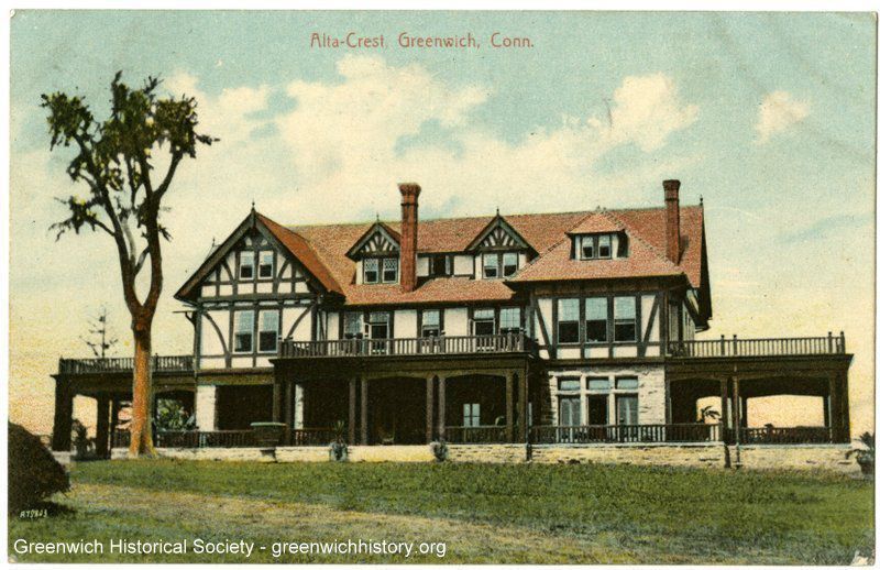 Depiction of a Tudor-style house with three porches and porticoes. Large windows overlook a sloping lawn with a tall tree.Collection