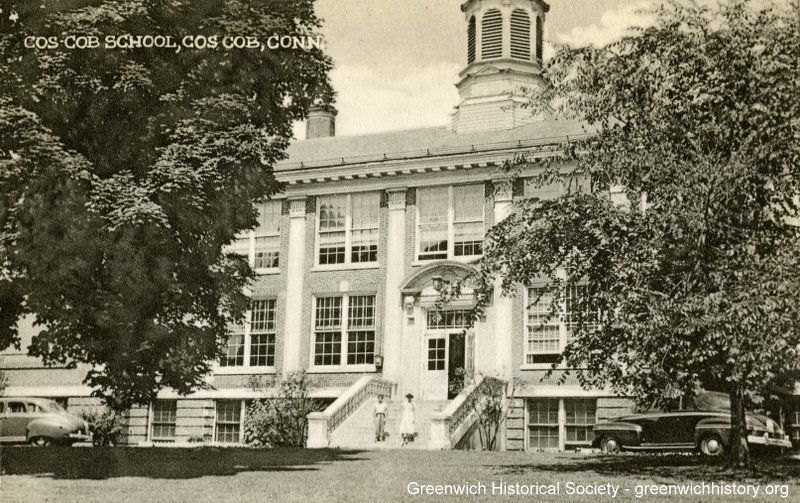 Black and white photograph of the front of the school, showing the front entrance stairs, windows, and trees. Two cars are parked by the entrance.Collection