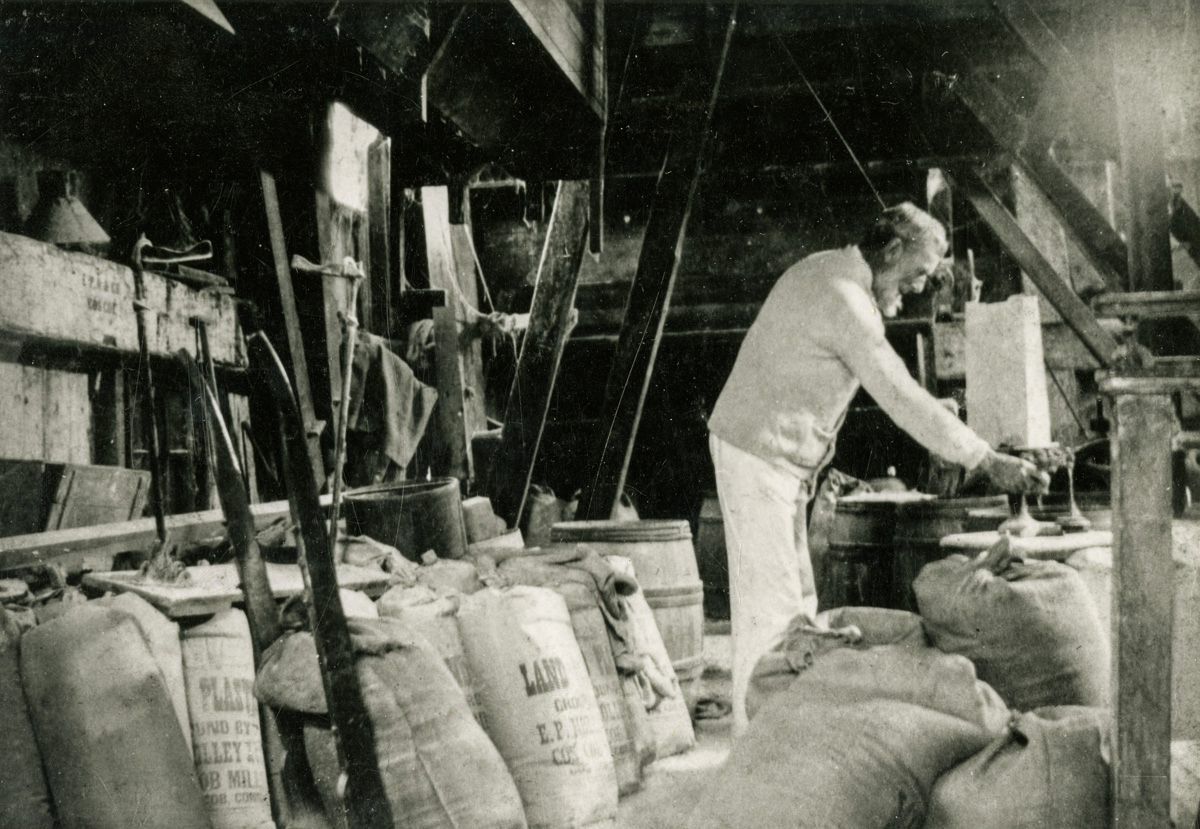 Edward P. Holley in the Bush Gristmill which he owned and operated, surrounded by sacks of flour ground at the mill.Collection