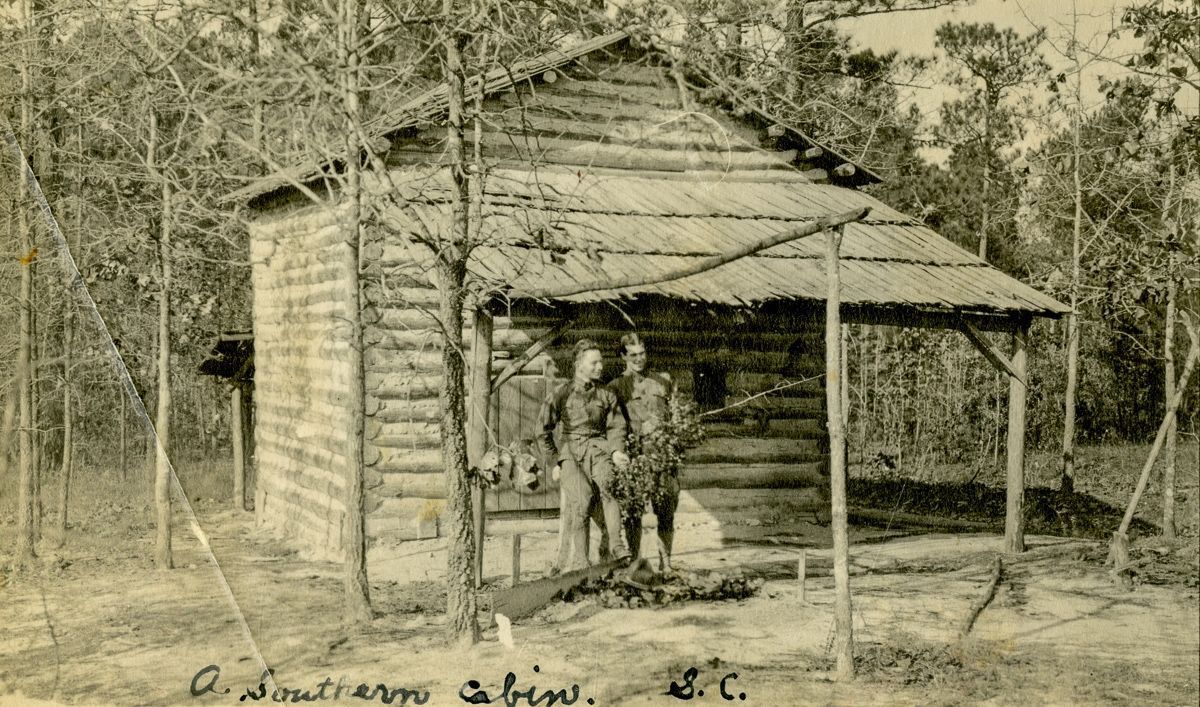 Two Boy Scouts standing outside of a log cabin with hand-hewn shingles and plaster chinking. The cabin is designed after a Southern tobacco drying cabin.Collection