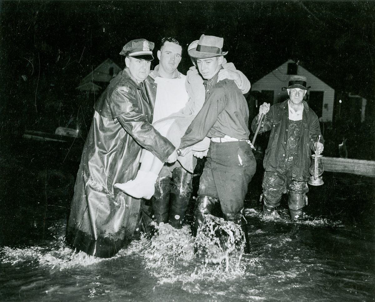 A group of men carrying a woman through a flooded area during the "Great New England Hurricane" of 1938.Collection