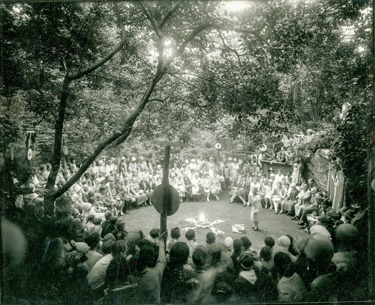 Members of the Woodcraft League at a campfire meeting.