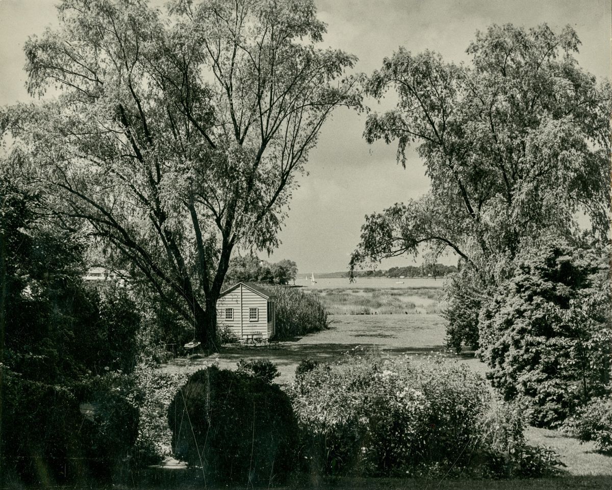 A view of the back yard of the Nathaniel Ferris house (179 Shore Road), looking out towards Greenwich Cove.Collection