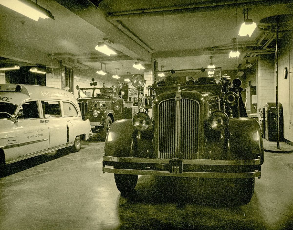 Fire engines in the garage of the Glenville Firehouse.Collection