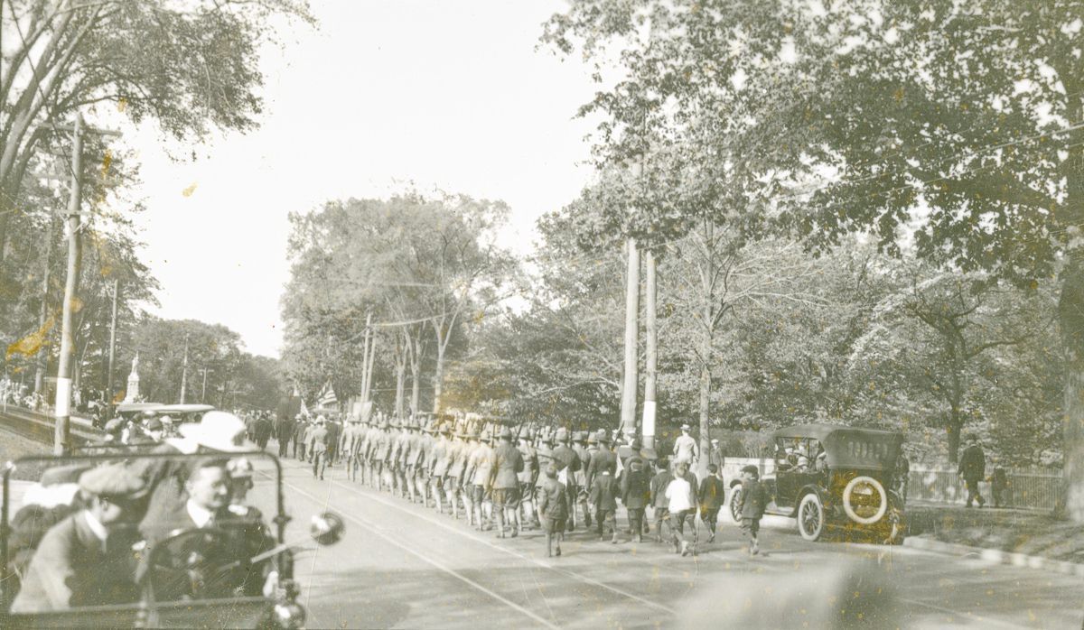 A World War One parade, heading east on East Putnam Avenue with the Soldier's Monument in the background of the image.Collection