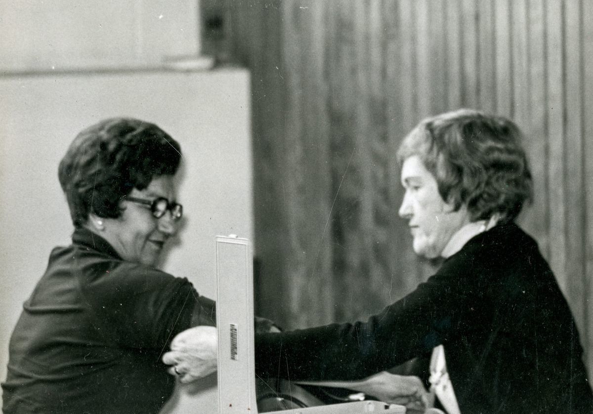 Volunteer Pat Parker taking the blood pressure of Minnie Moretti at the Easter Greenwich Civic Center during The Sunday Senior Social.Collection