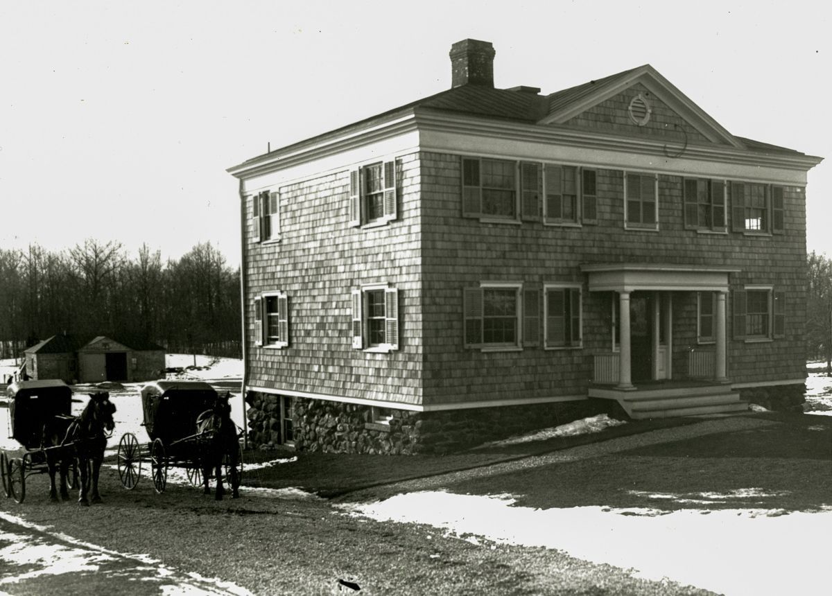 Two horse-drawn buggies outside the Greenwich General Hospital.
