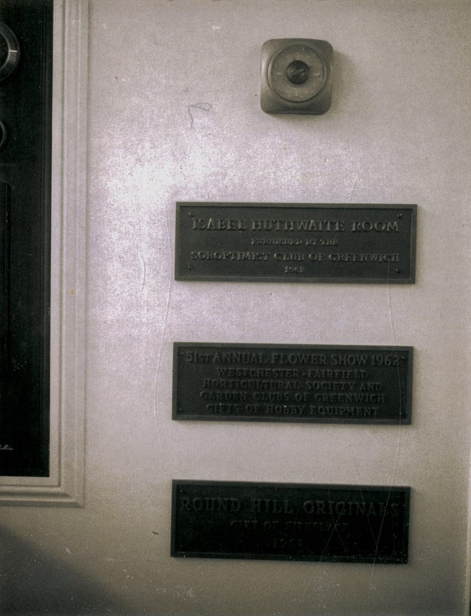 Plaques on the wall of a building including one that names the " Isabel Huthwaite Room" that had been furnished by the Soroptimist Club of Greenwich.Collection