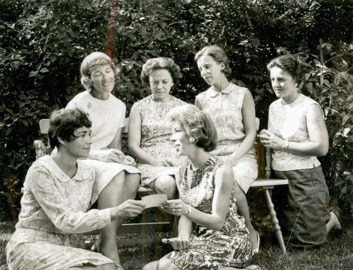 Alumnae of the Greenwich Hospital School of Nursing sitting on and around a bench.