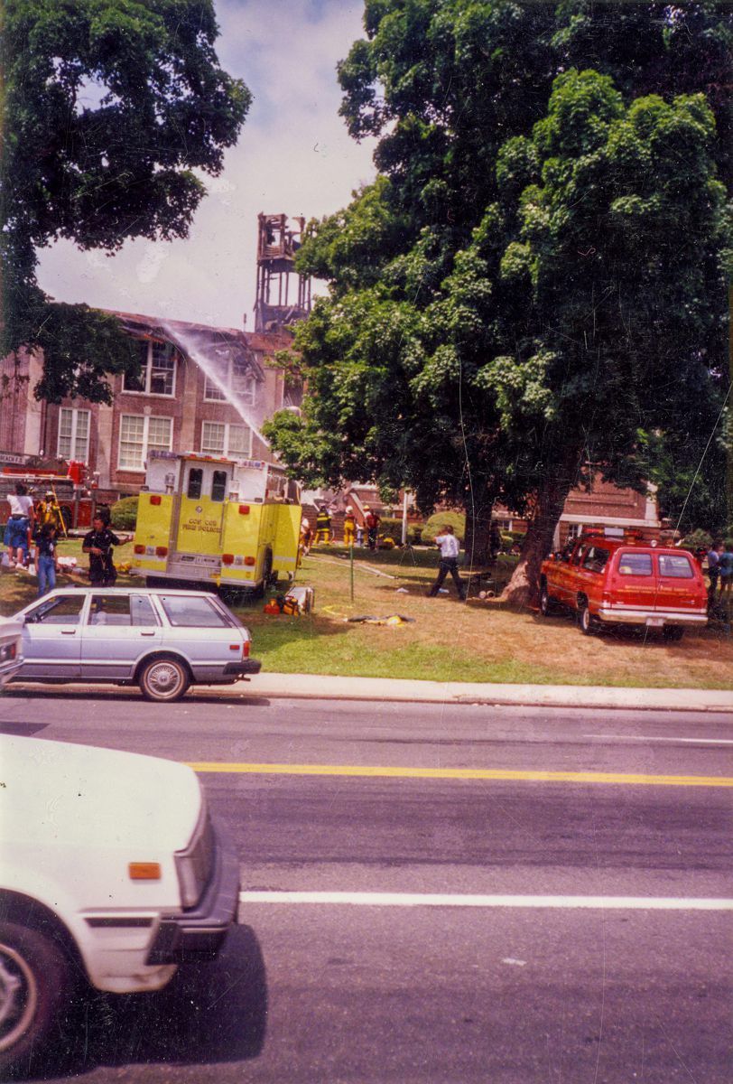 Images of firefighters dealing with a large fire at Cos Cob Elementary School on July 29, 1990 and images of the damaged structure.Collection