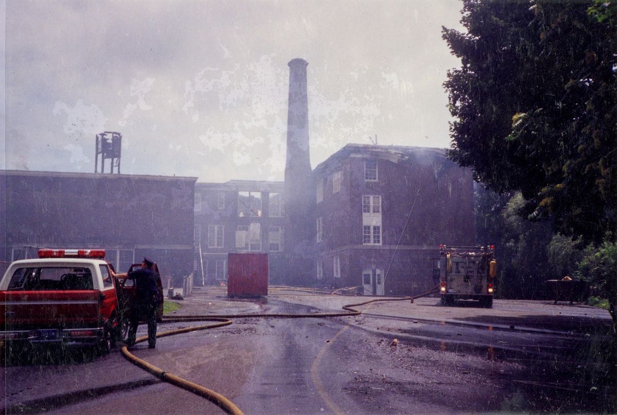 Images of firefighters dealing with a large fire at Cos Cob Elementary School on July 29, 1990 and images of the damaged structure.Collection