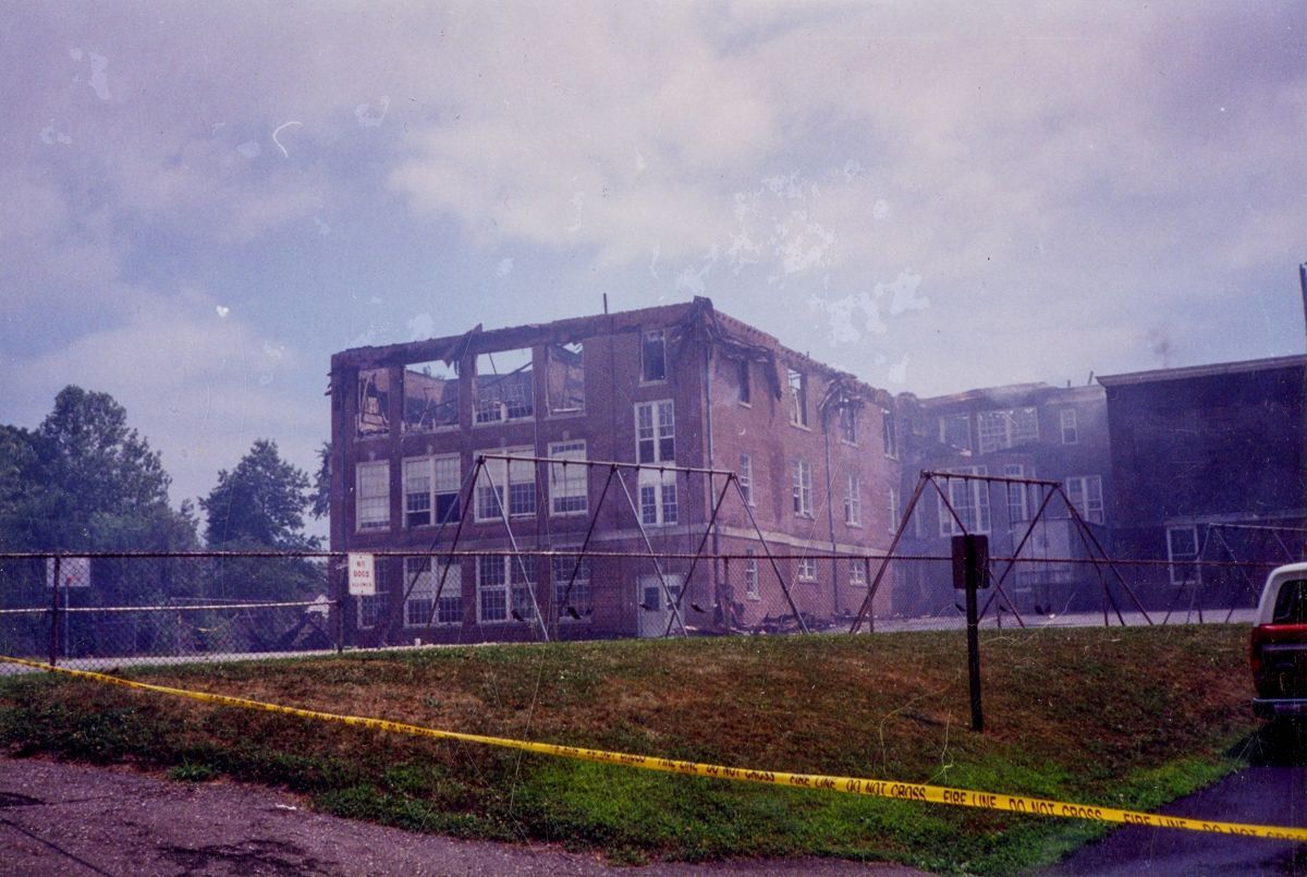 Images of firefighters dealing with a large fire at Cos Cob Elementary School on July 29, 1990 and images of the damaged structure.Collection