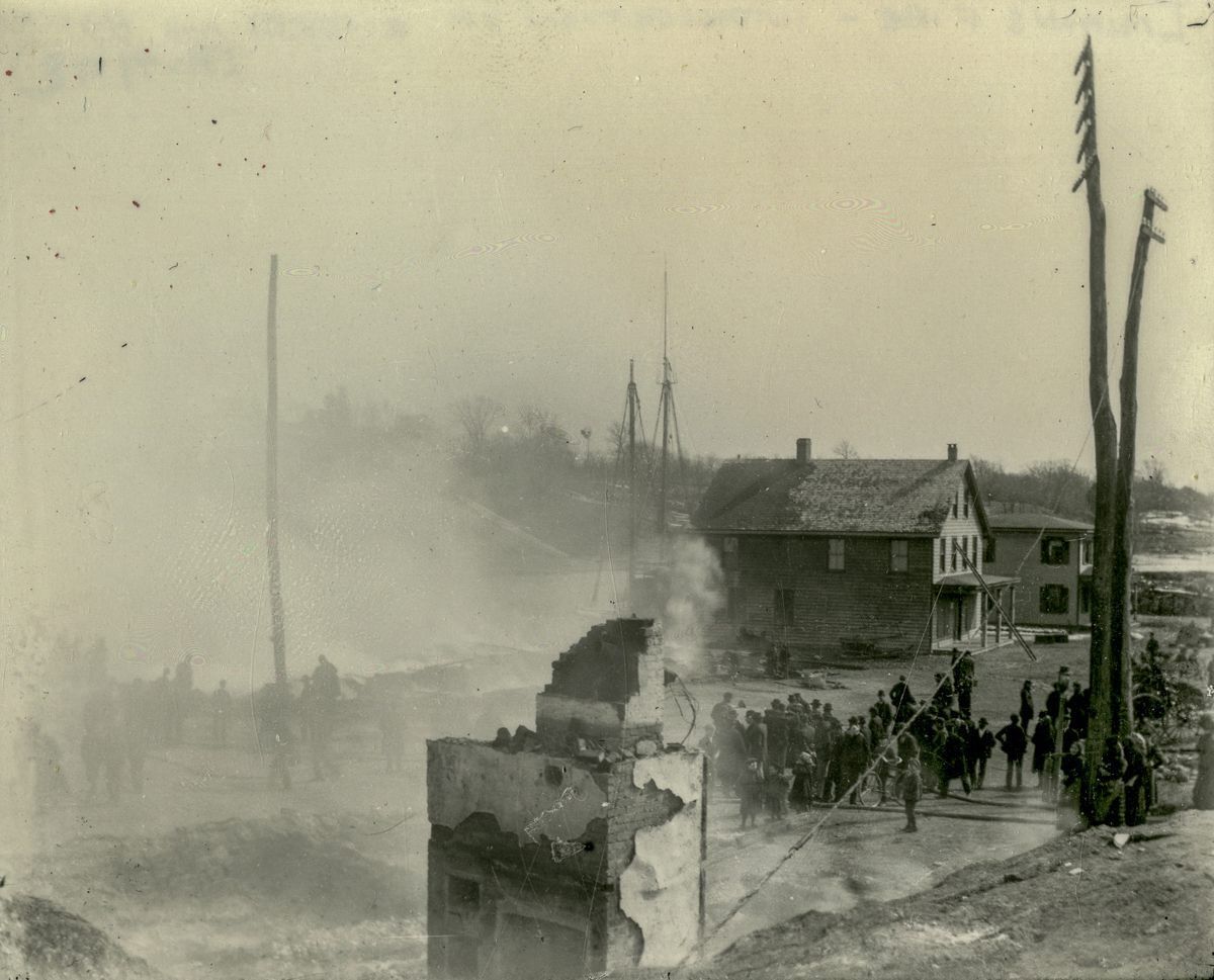 Two images of people looking at the aftermath of a fire that burnt buildings standing at the intersection of River Road and the Post Road.Collection