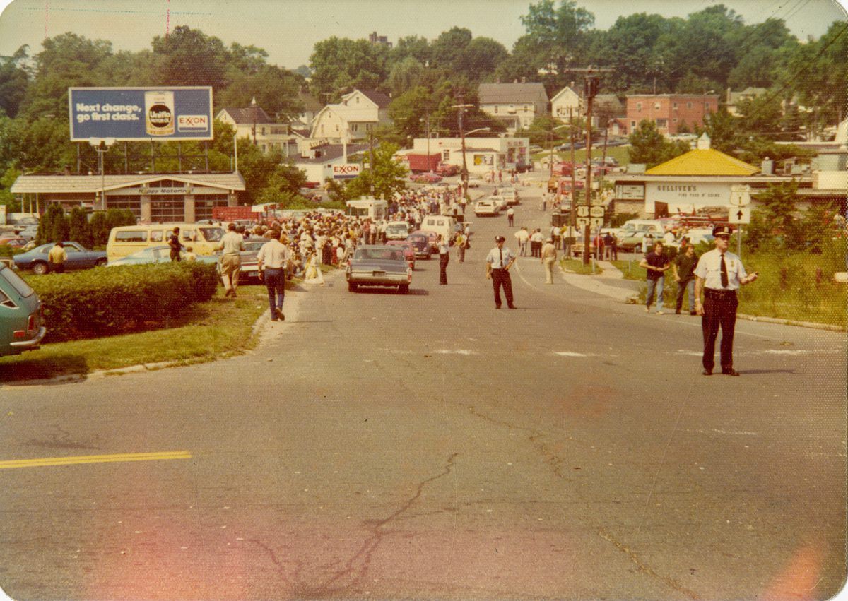 Two images of people standing outside Gulliver's Restaurant after a large fire gutted the building. The fire was the result of arson in a neighboring bowling alley, set to cover up a burglary; the restaurant had a lower level nightclub and when the fire spread to it, it claimed the lives of 24 patrons and injured 19 patrons and 13 firemen who responded to the emergency.Collection