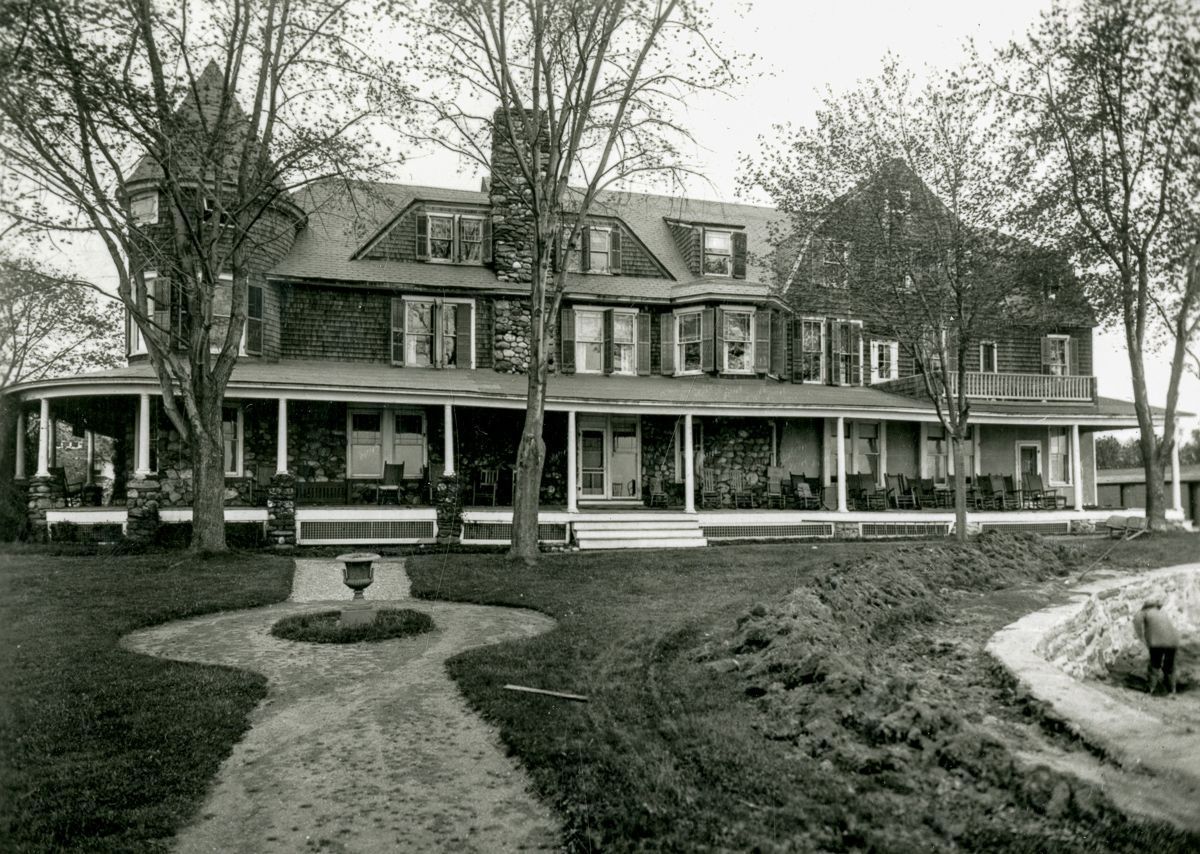 Views of the Kathmere Inn, originally the home of William G. and Lillian Happy, it became an inn, ran by Betty Richmond for eight years. The three story field stone and shingle waterside building with a field stone and shingle facade had a full length wrap around porch off the first floor and a smaller porch off the second floor; a two story round turret with conical roof; a second story bay window; multiple dormers in the roof; and a field stone chimney.Collection