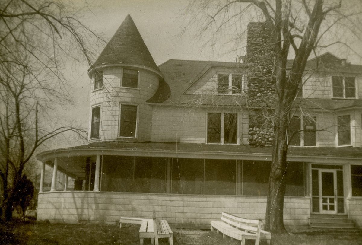 Views of the Kathmere Inn, originally the home of William G. and Lillian Happy, it became an inn, ran by Betty Richmond for eight years. The three story field stone and shingle waterside building with a field stone and shingle facade had a full length wrap around porch off the first floor and a smaller porch off the second floor; a two story round turret with conical roof; a second story bay window; multiple dormers in the roof; and a field stone chimney.Collection