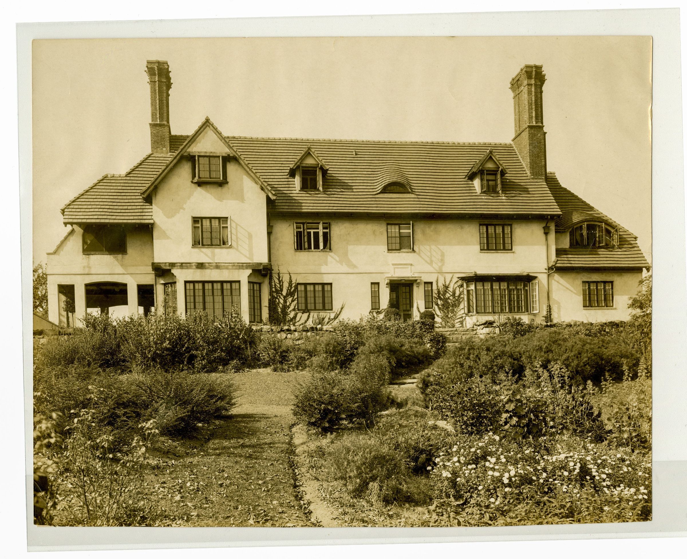 A three-story home with a shingle roof and gardens in foreground.
