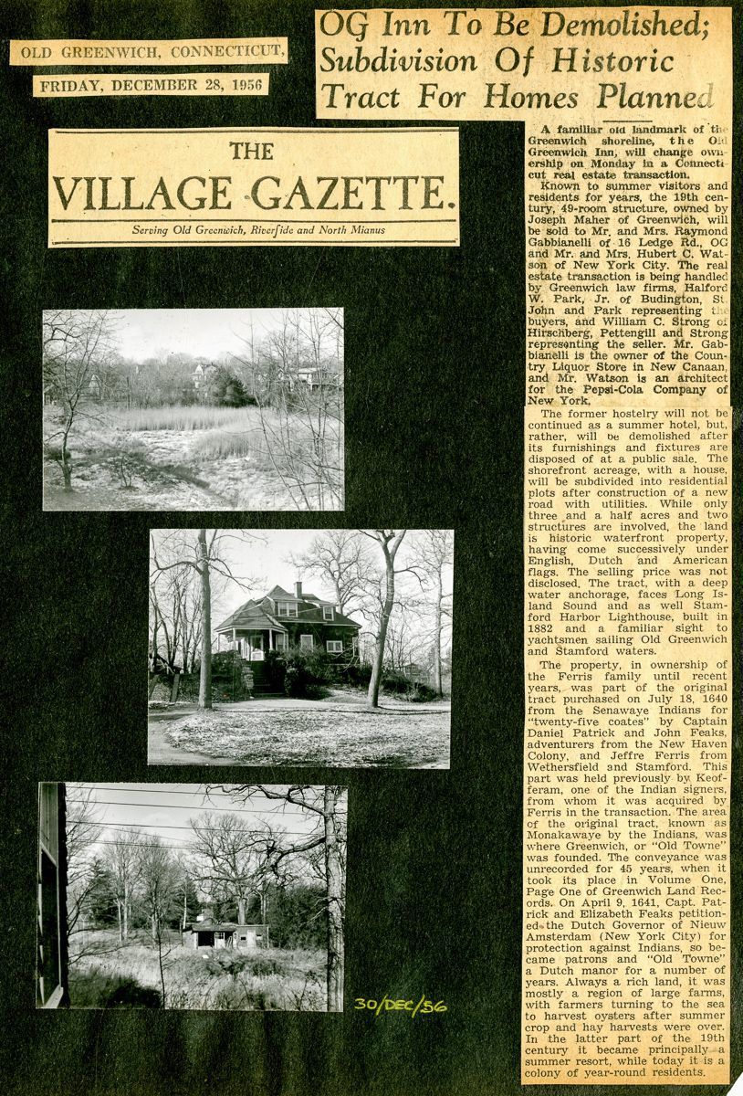 Pages from an album with images from brochures, personal photographs, and newspaper clippings to do with the Old Greenwich Inn, its demolition in 1956, and the later construction of houses on the site.Collection