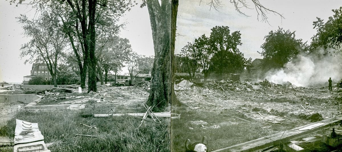 Pages from an album with images from brochures, personal photographs, and newspaper clippings to do with the Old Greenwich Inn, its demolition in 1956, and the later construction of houses on the site.Collection