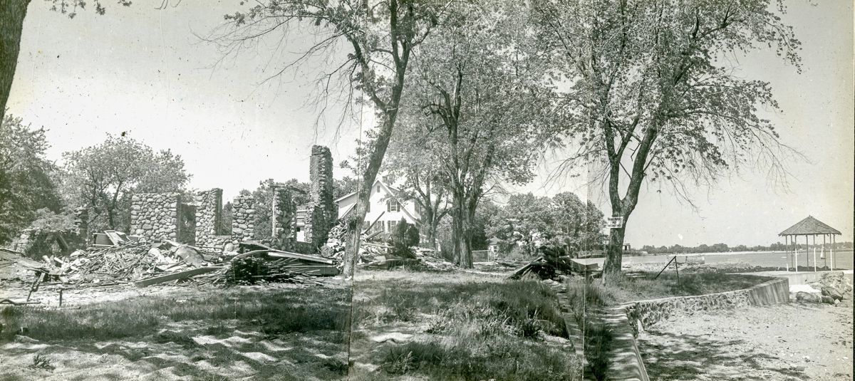 Pages from an album with images from brochures, personal photographs, and newspaper clippings to do with the Old Greenwich Inn, its demolition in 1956, and the later construction of houses on the site.Collection